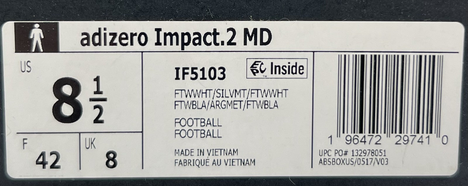 Adidas Adizero Impact.2 MD Football Cleats Men’s Size 8.5 White/Silver IF5103