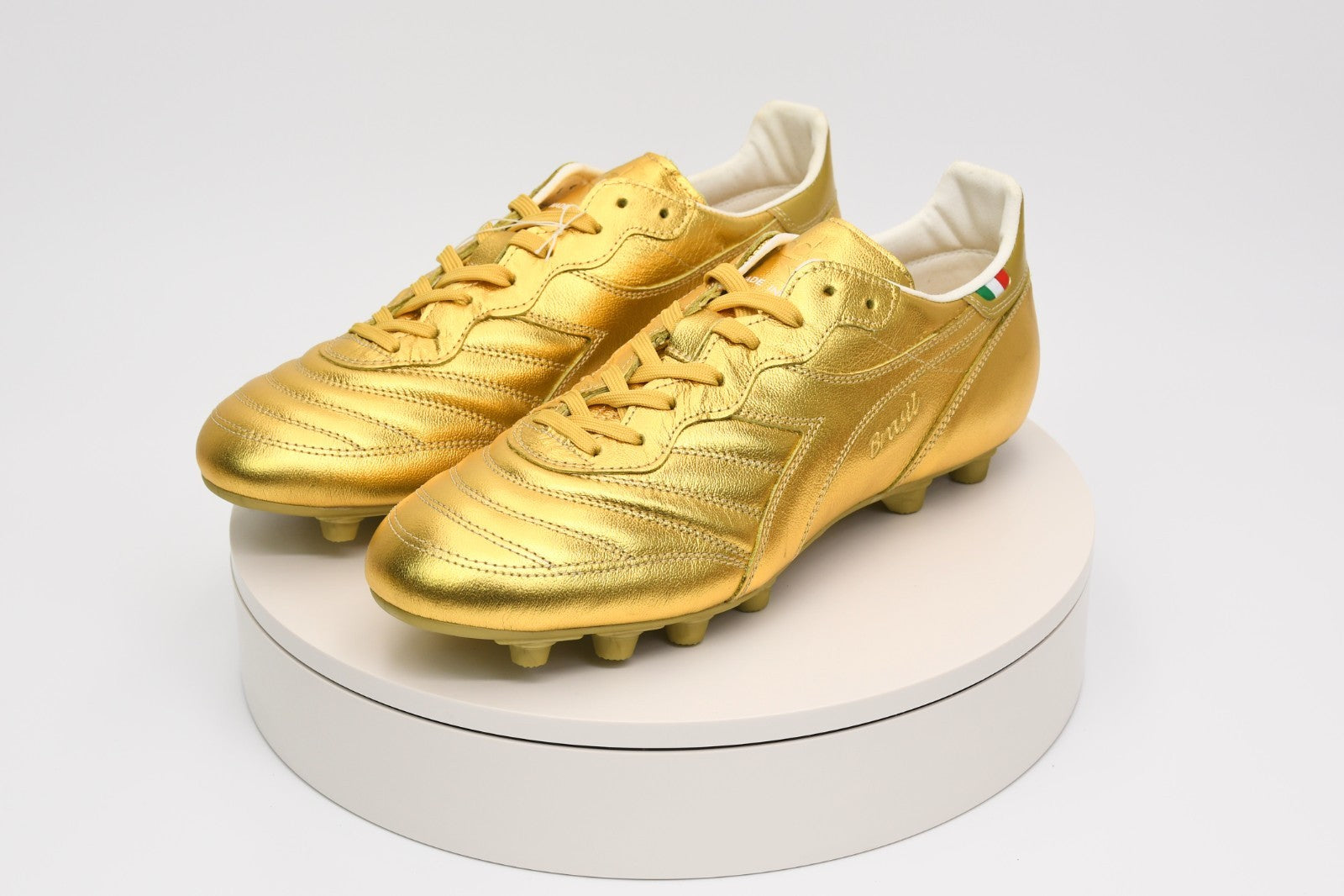 - Gold "Brasil" and Diadora branding with Italian flag detail