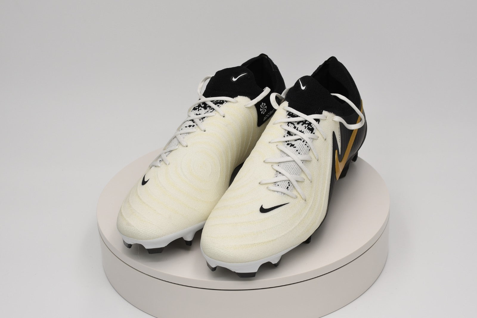 are built for precision, control, and explosive agility on firm-ground natural grass fields. Featuring a striking white base with black and metallic gold accents, these cleats combine lightweight materials with Nike's ACC technology for superior ball control in all conditions.